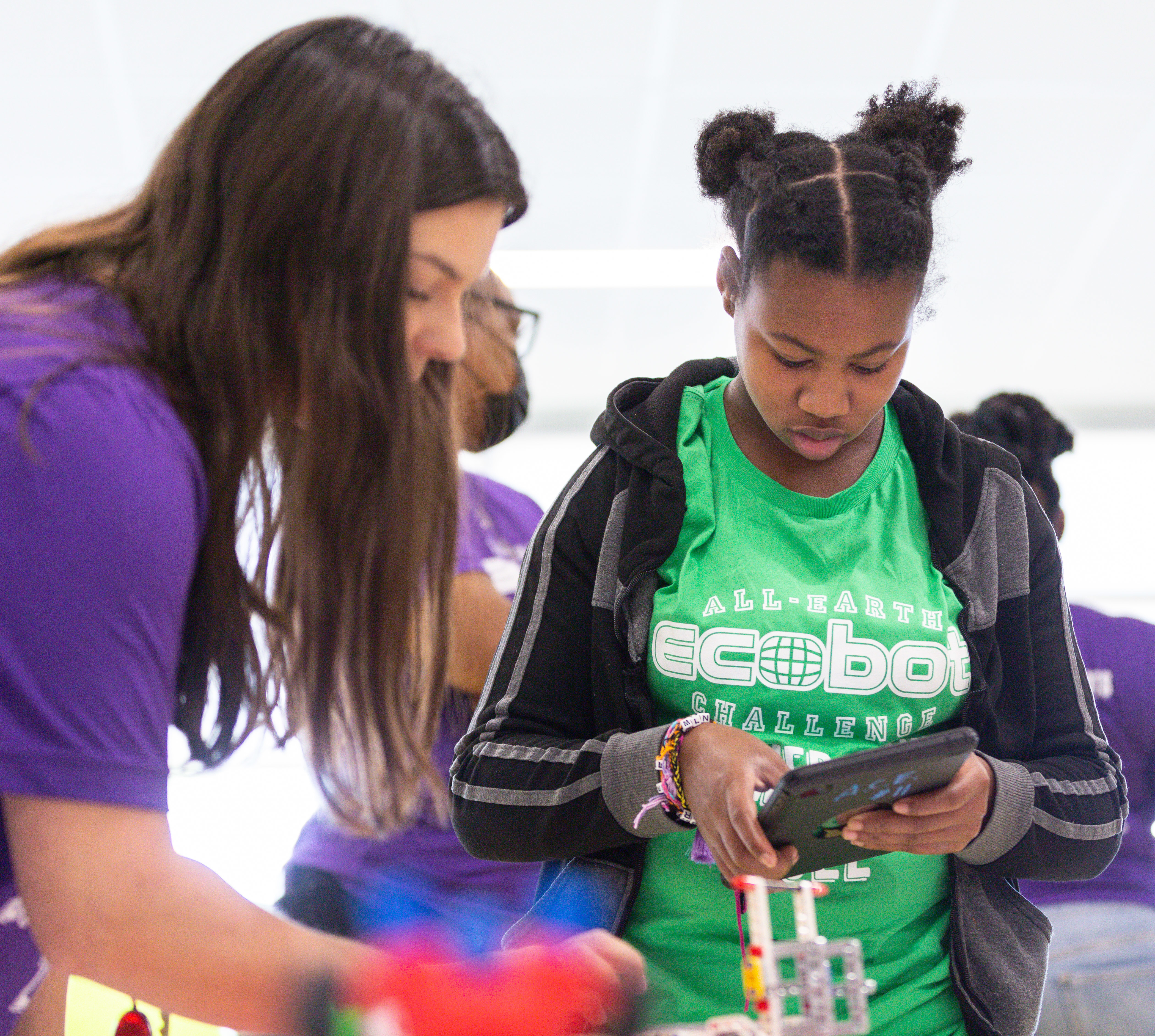 Teacher Ann Mustacchia helps a student set up her robot in the All-Earth Ecobot Challenge at Academic and Behavioral School West, July 14, 2022.